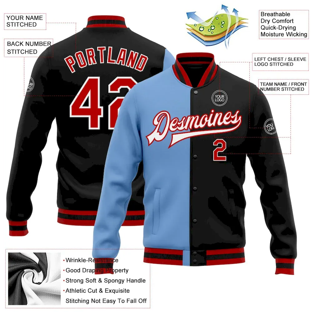 Custom Black Red-Light Blue Bomber Full-Snap Varsity Letterman Split Fashion Jacket