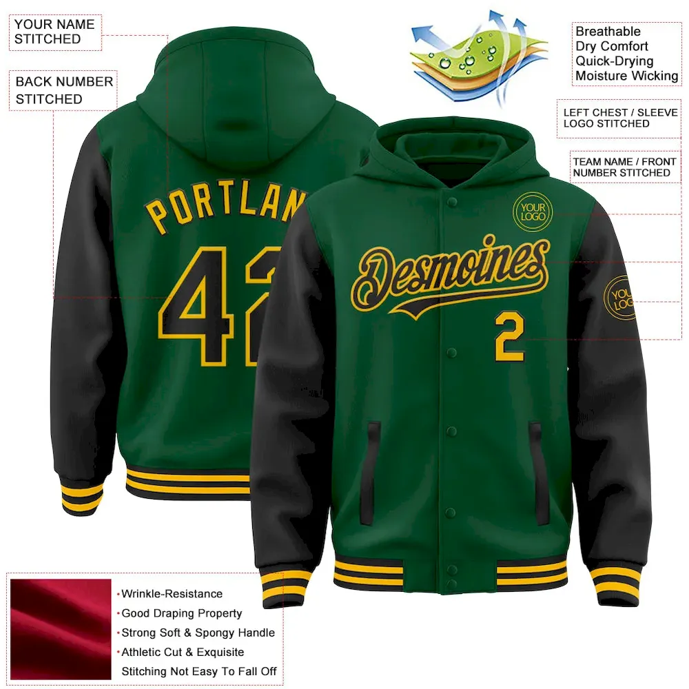 Custom Kelly Green Black-Gold Bomber Full-Snap Varsity Letterman Two Tone Hoodie Jacket