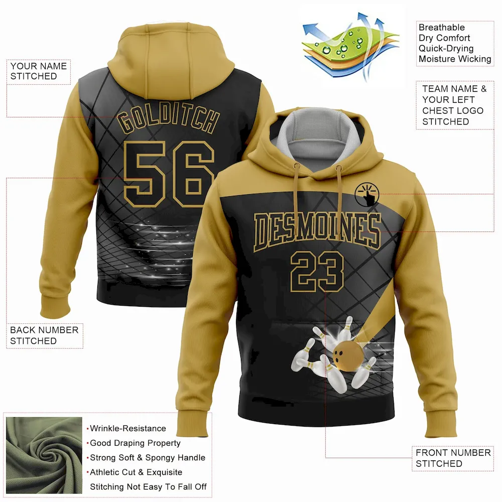 Custom Stitched Black Old Gold 3D Bowling Sports Pullover Sweatshirt Hoodie