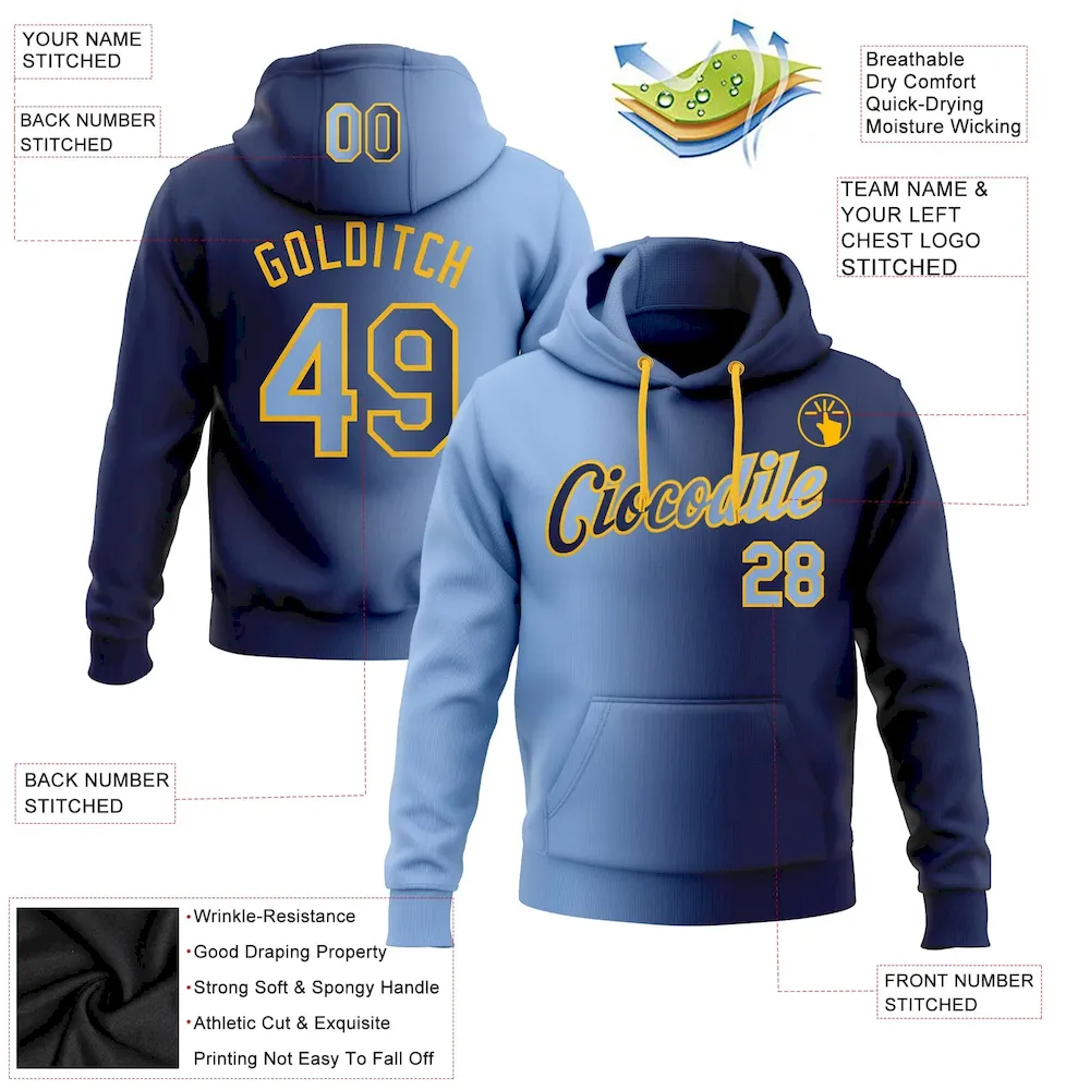 Custom Stitched Navy Light Blue-Gold Gradient Fashion Sports Pullover Sweatshirt Hoodie