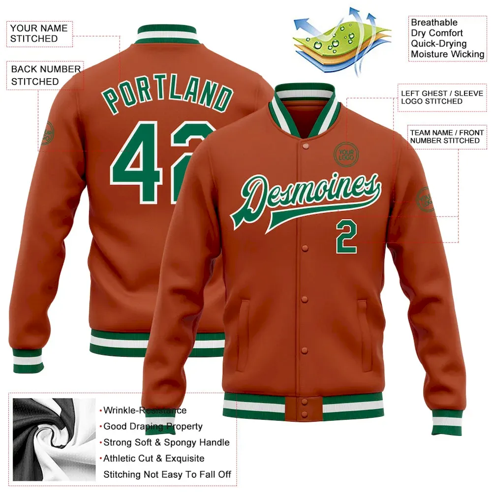 Custom Texas Orange Kelly Green-White Bomber Full-Snap Varsity Letterman Jacket